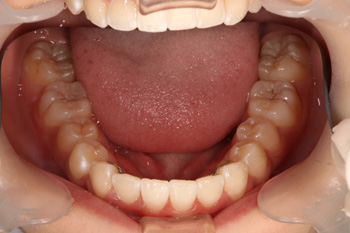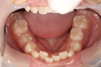 小児矯正と成人矯正の違いは、歯を並べるスペースを拡げて作るか抜いて作るかというところがあります(※成人後も抜歯無しで並べれる場合もあります)。大人になってからの矯正では外科手術以外顎の骨格を変えることはできませんのが、Ⅰ期矯正を行うことで歯を並べるスペースを確保し、抜歯せずに歯を並べることが可能となります。約2年で、歯を並べるスペースを確保し、きっちり歯も並びました。