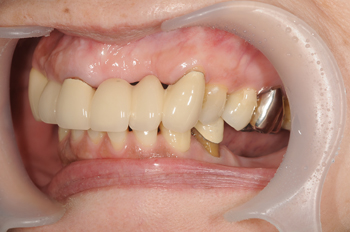 | 治療の内容 | インプラント治療3本、歯肉の足りない箇所にFGG(歯肉の移植術)、銀歯2本をセラミック補綴に替える治療。 |