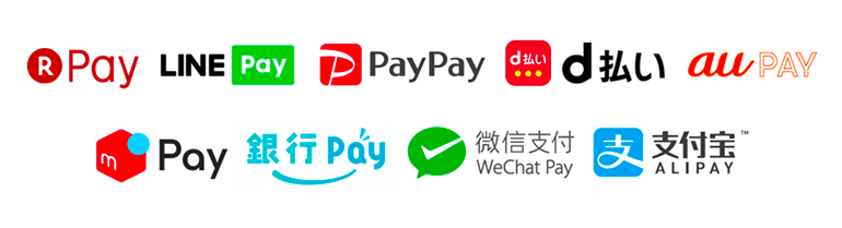 「楽天ペイ、LINE Pay、PayPay、d払い、au PAY、メルペイ、銀行Pay、WeChat Pay、ALIPAY」などがご利用頂けます。